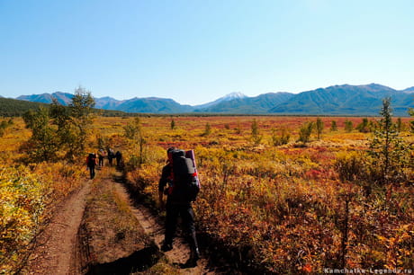 Переход. Утром собираем лагерь и отправляемся к Тимоновским горячим источникам. Идти будем много, иногда с переходом вброд реки Средней Авачи, но в основном по уже протоптанным тропам. Лишь во второй части маршрута нам придется пройти сквозь густые заросли, чтобы выйти на автомобильную дорогу, проложенную джипами.