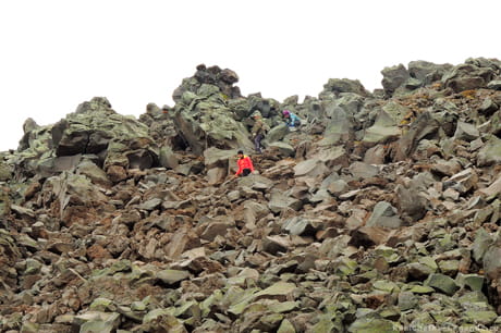 Восхождение. Поднимаемся по крупным камням, поросшим редким лишайником. Подъем в целом проходит несложно. Трудности начинаются на финальных 300 м, когда крутизна склонов достигает 35˚. Преодолеваем их и добираемся до вершины вулкана.