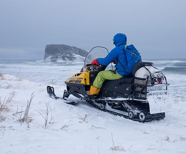 Участники пересаживаются на снегоход и нарты и укрываются теплыми пледами. После короткого инструктажа по технике безопасности группа начинает путь по снежной дороге.