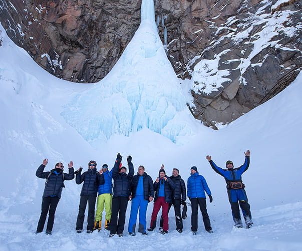 Группа прибывает к подножию Вилючинского вулкана и поднимается к ущелью с замерзшим водопадом. Его голубая полоса, огороженная отвесными скалами, видна уже за полкилометра. Вблизи она становится 40-метровой глыбой льда причудливой формы. Иногда рядом можно обнаружить ее крупные ледяные осколки.